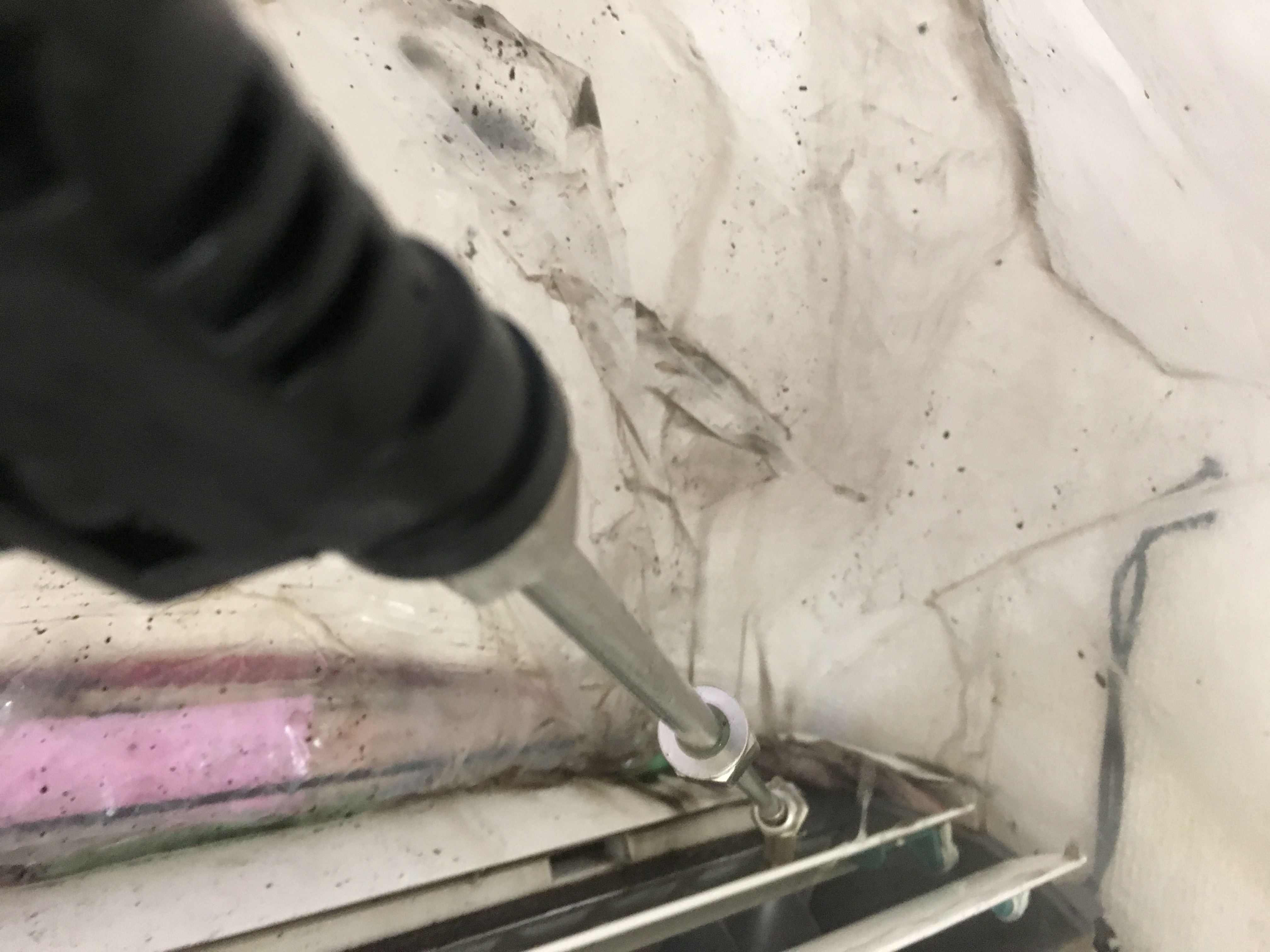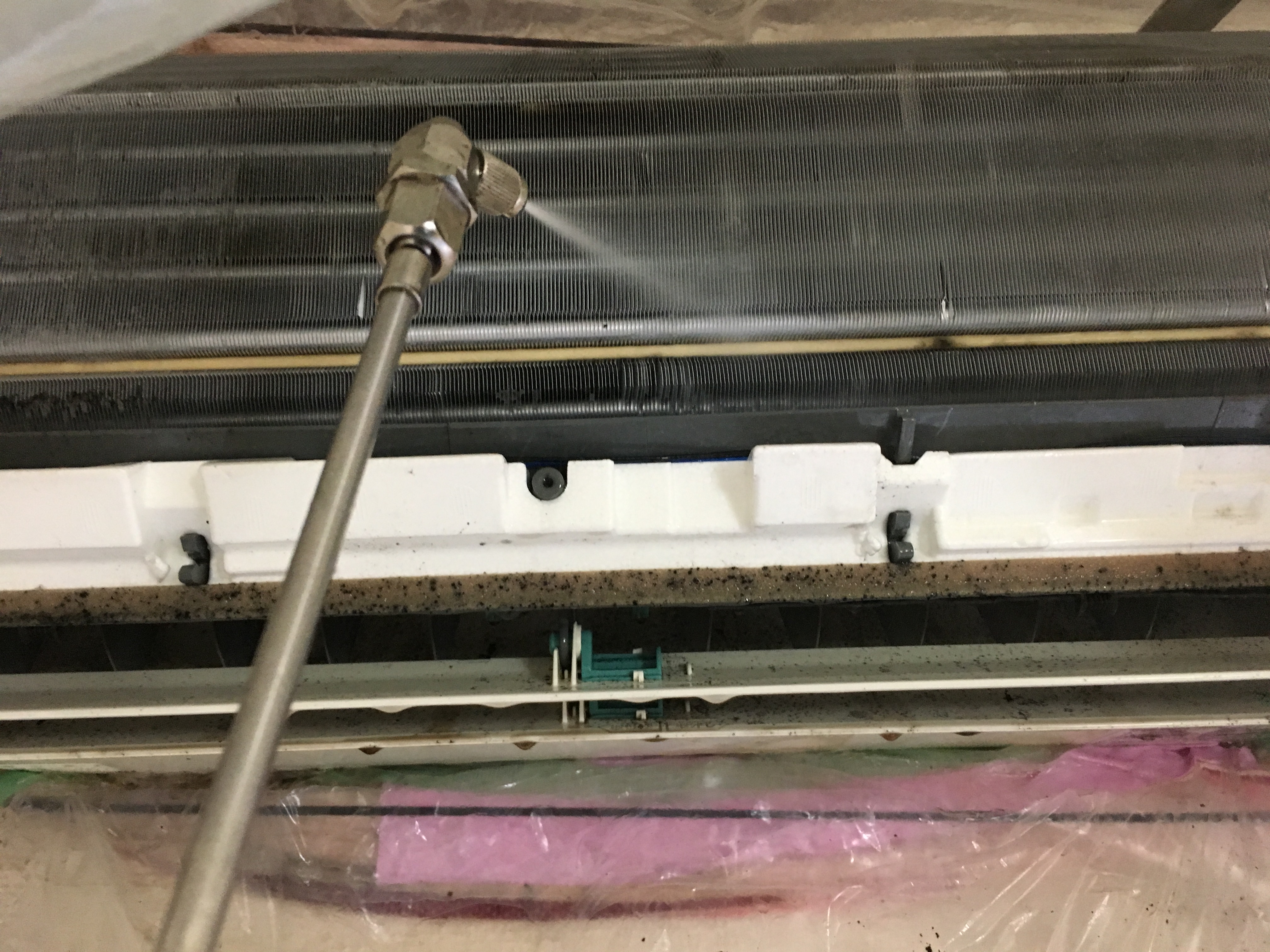 周りを養生し、エアコン全体にカバーをしてから、エアコンのカビを殺す洗剤をかけて、専用の高圧機器で洗浄します。