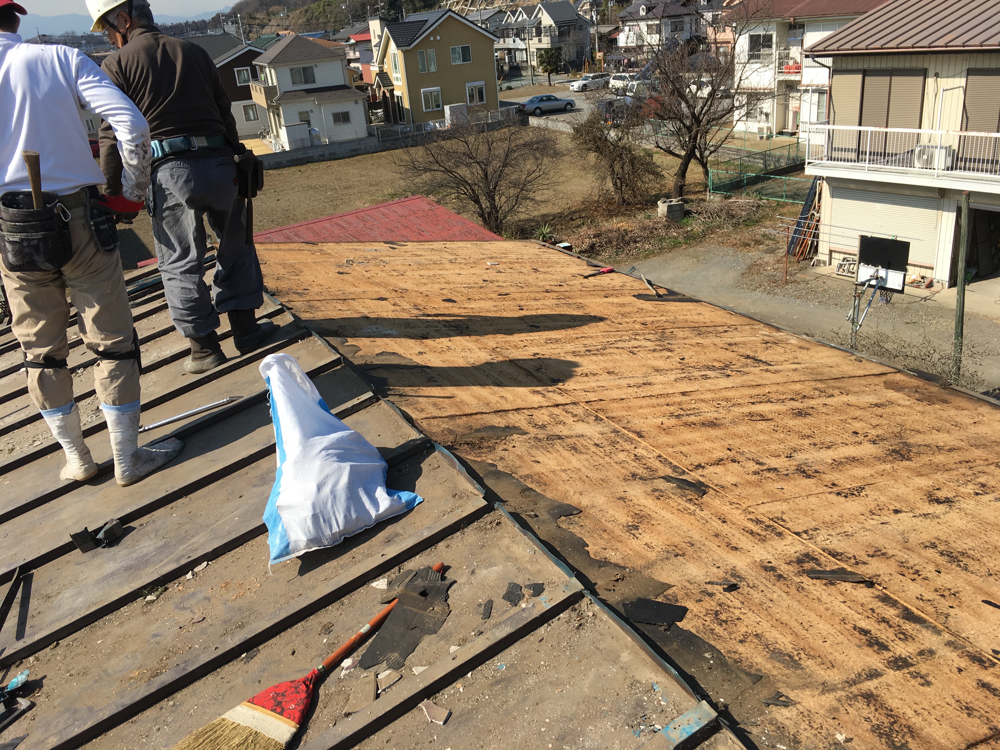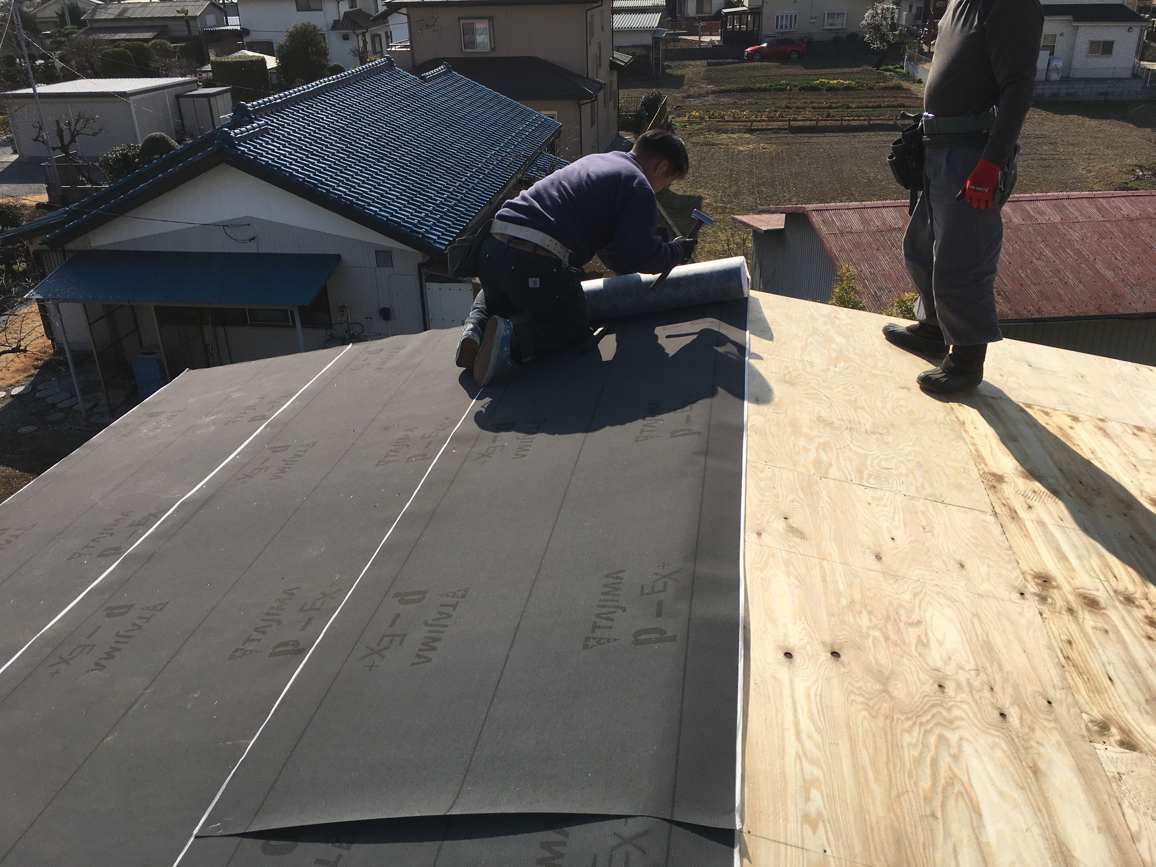 古い屋根材を外してから、下地を新しいものに変えて、防水シートを貼っているところです。