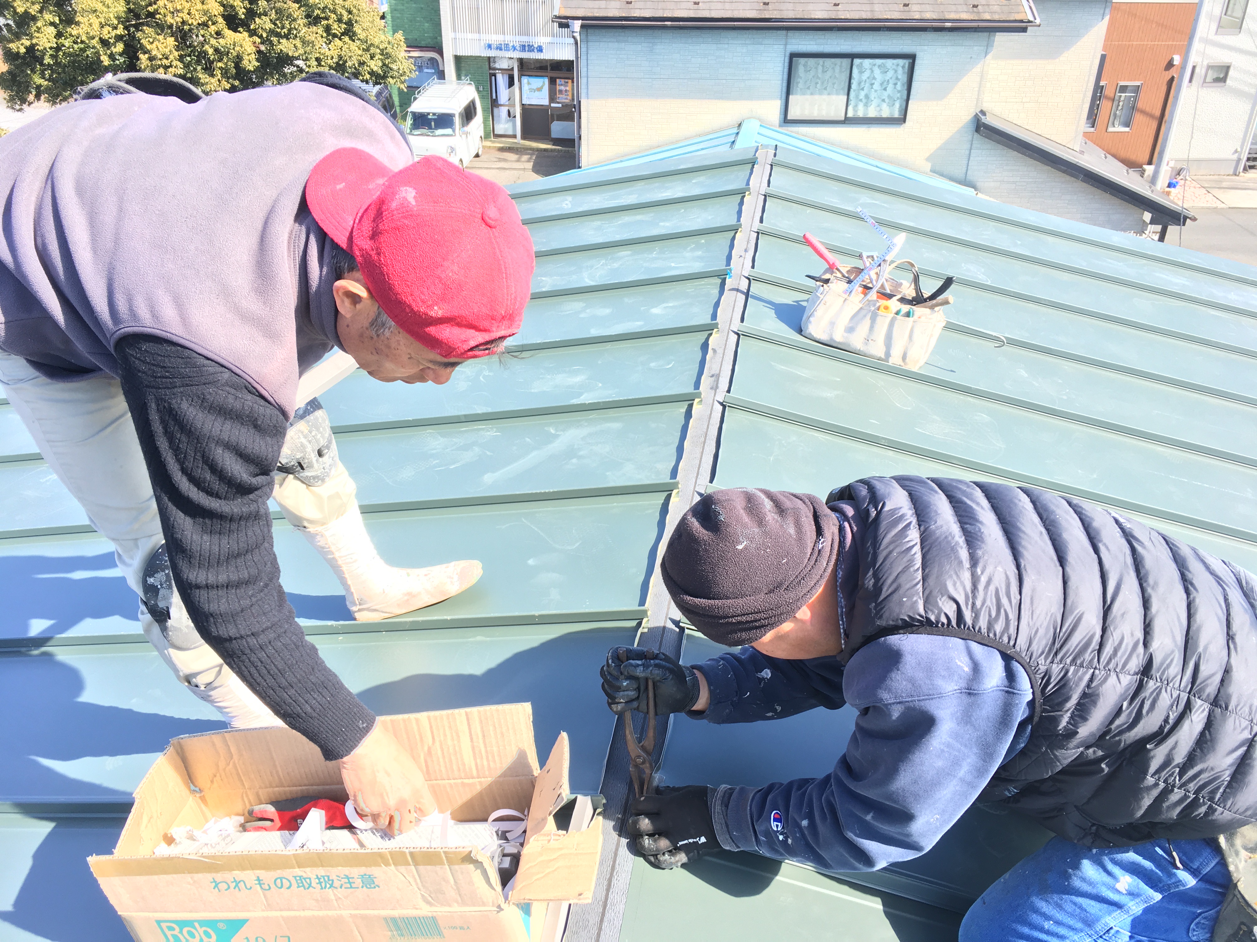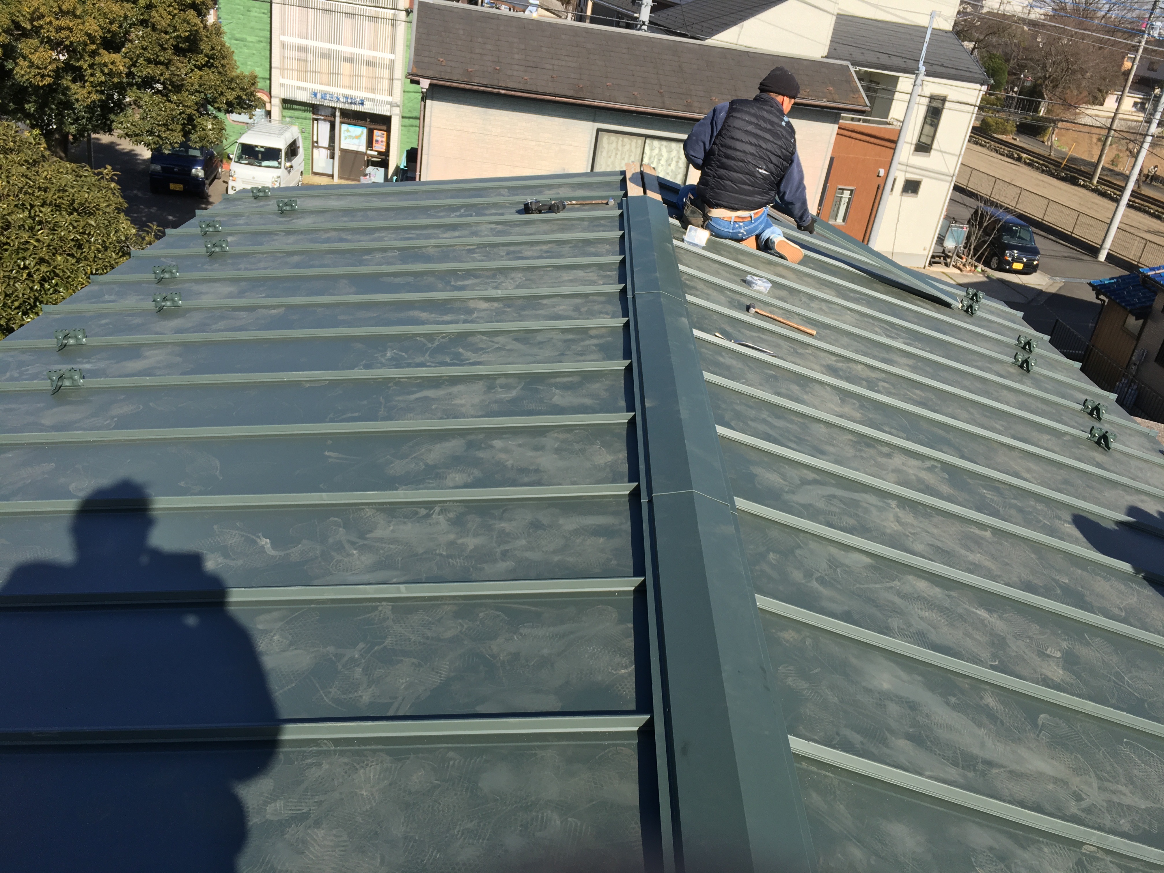 この写真は、スタンビーを張っていくところです。この前に、下地を新しく張替え、その上に、防水シートを張っていきます。
