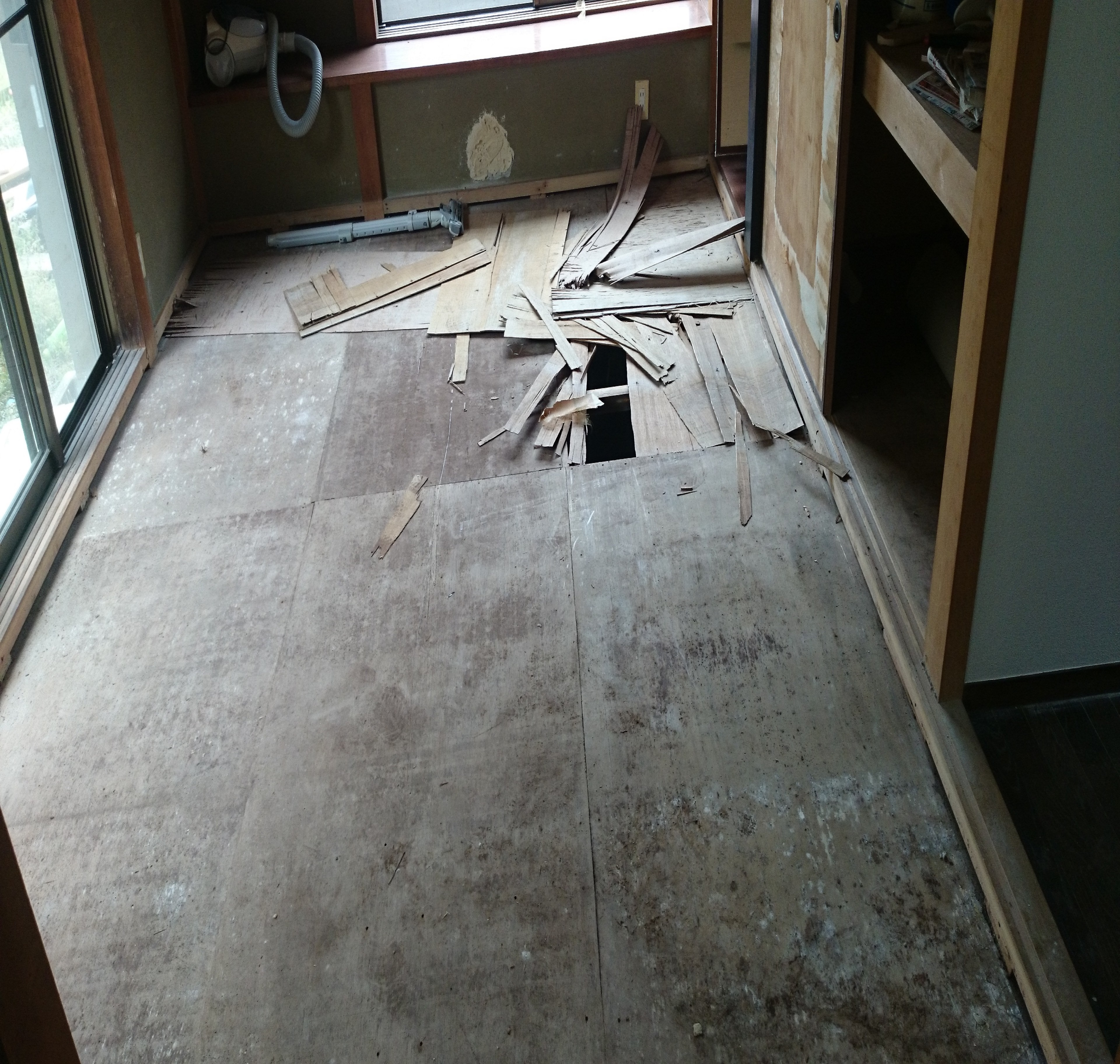 これは、和室です。畳の下が写真のように腐っていました。これから、畳の下を外します。