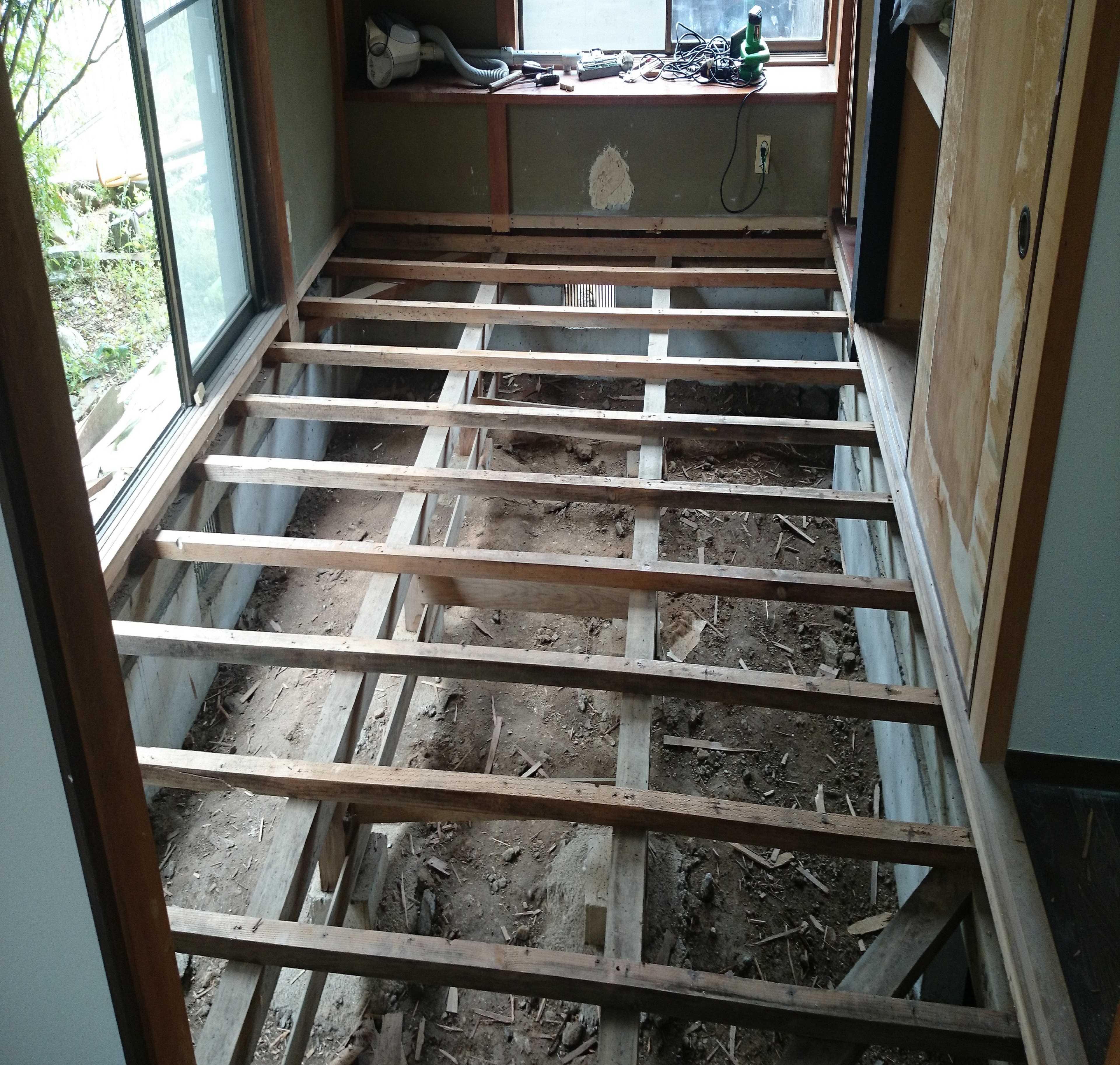 まず、下地の直しをします。腐食した部分または全体を取り除きます。次に、床張りに入ります。